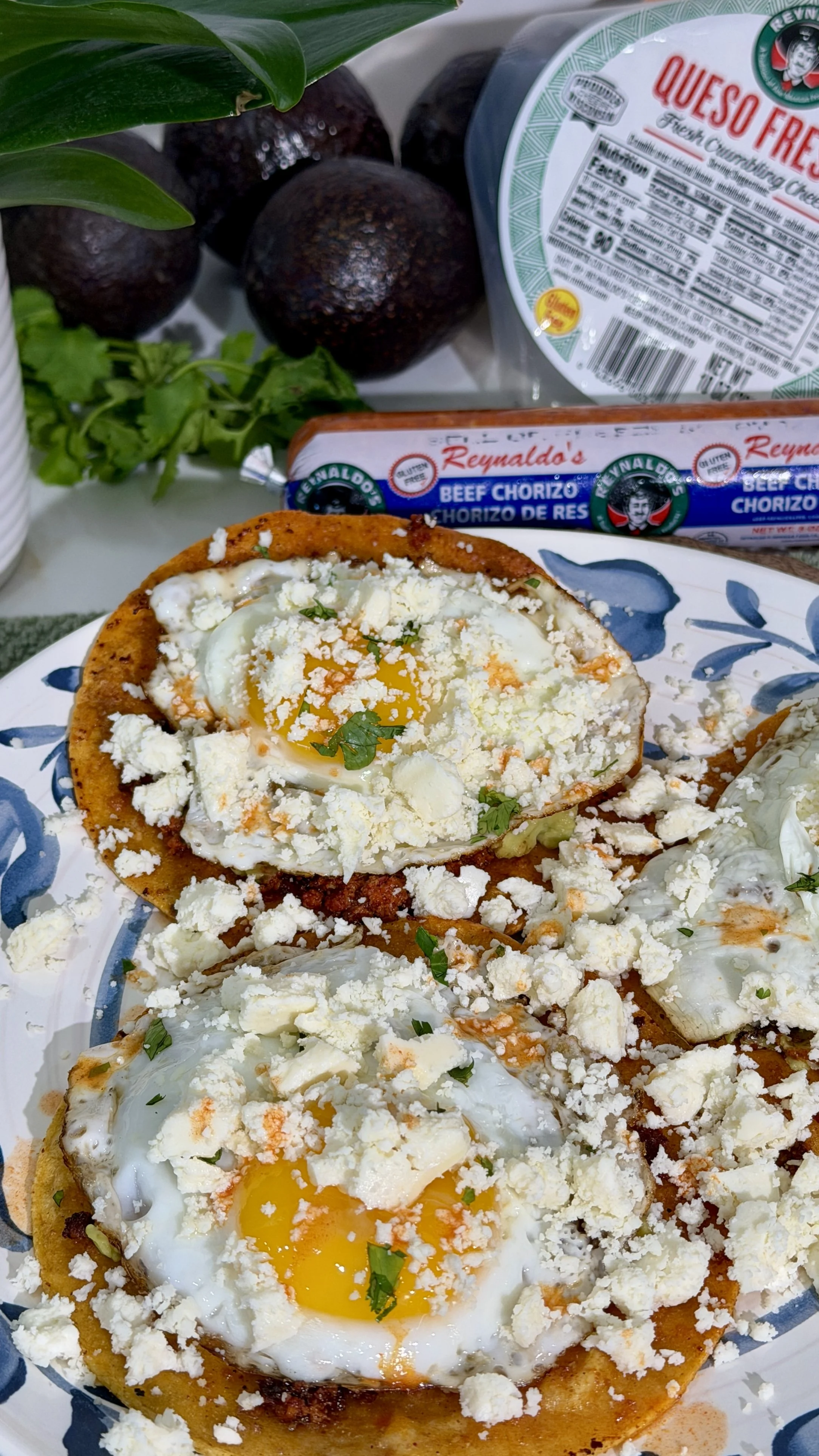 Assemble the tacos: start with the chorizo tortillas, then add the guacamole. Add the eggs, then garnish with the fresh cilantro and Reynaldo’s queso fresco. Drizzle with hot sauce and enjoy.
