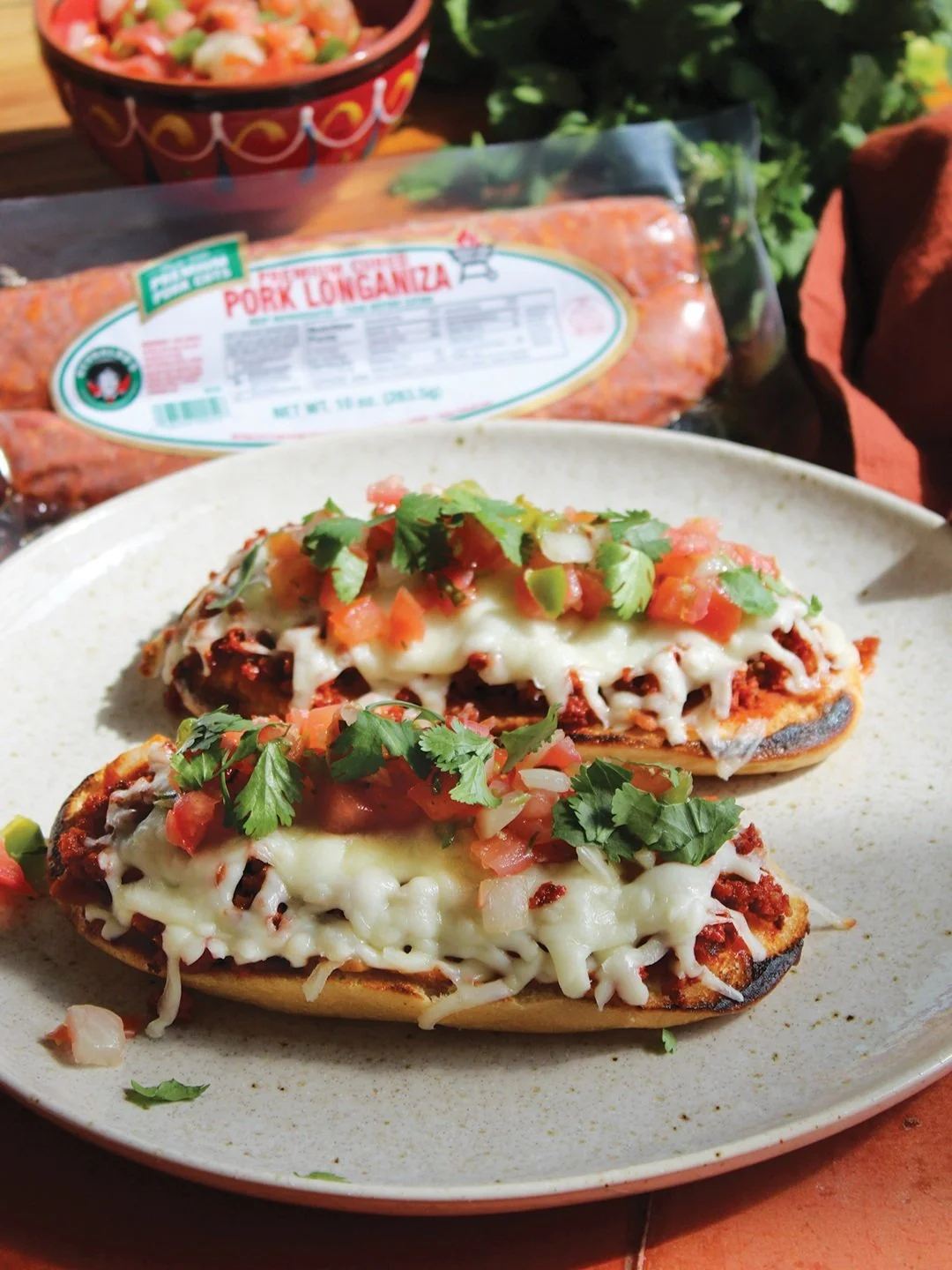 To both sides of the roll, add a layer of beans and a layer of Longaniza. Top with the Oaxaca and place under the broiler until the cheese is melted.